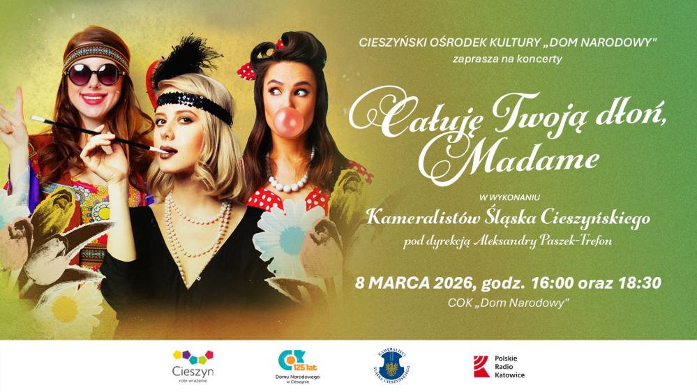 Wyjątkowy sposób na spędzenie Dnia Kobiet? Cieszyński Ośrodek Kultury „Dom Narodowy” zaprasza na niezwykły koncert Kameralistów Śląska Cieszyńskiego pt. „Całuję Twoją dłoń, Madame”.  Ten kameralny wieczór muzyczny to podróż przez czas i style - od barokowych salonów po paryskie impresjonistyczne wnętrza, od operetkowego blasku po retro klimaty lat 20. W repertuarze znajdą się pieśni i utwory instrumentalne, które łączą różne epoki, style i kultury, tworząc spójną opowieść o miłości, tęsknocie i pięknie gestu.