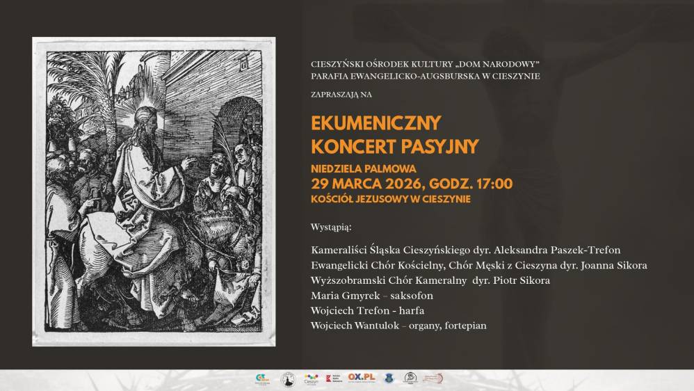 Cieszyński Ośrodek Kultury "Dom Narodowy" i Parafia Ewangelicko-Augsburska w Cieszynie zapraszają na Ekumeniczny Koncert Pasyjny. Wydarzenie odbędzie się w Niedzielę Palmową, 29 marca 2026 r. o godzinie 17:00 w Kościele Ewangelickim w Cieszynie.